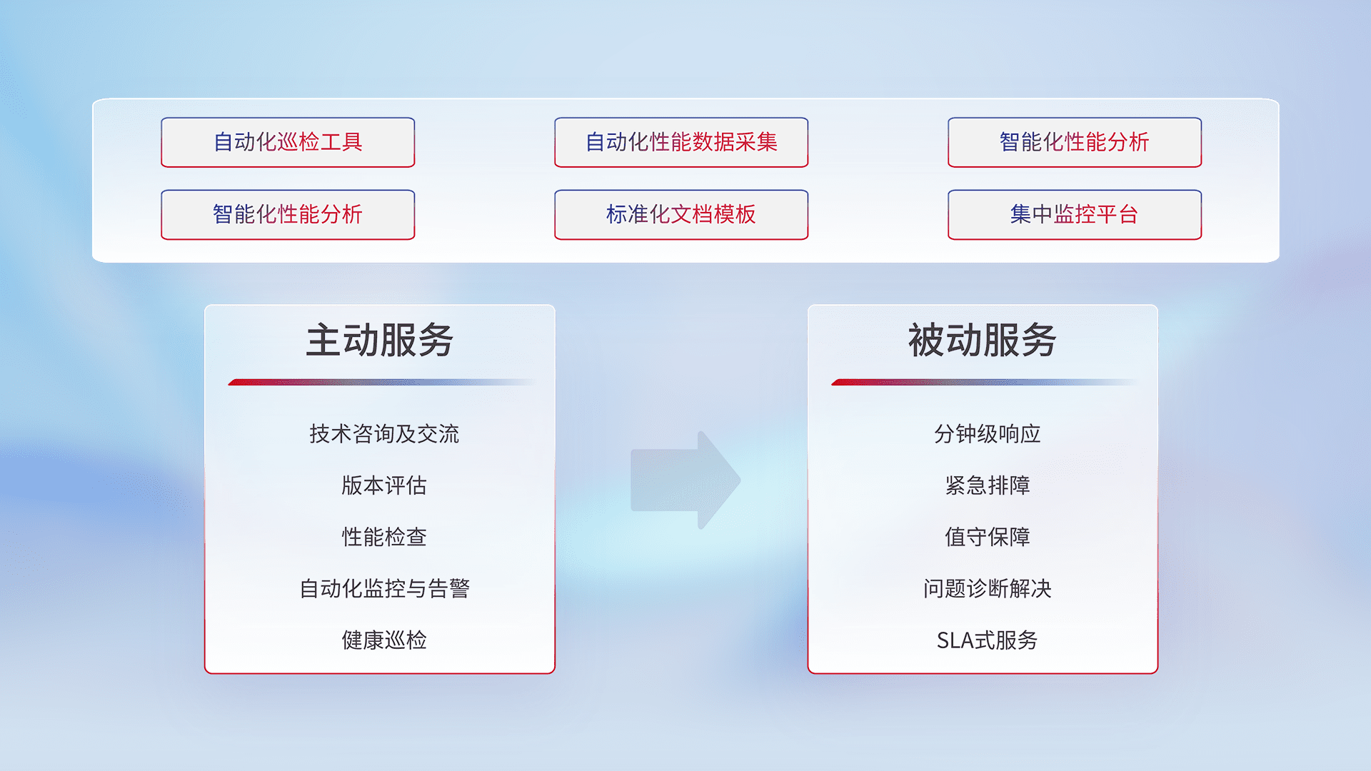 智能化工具和标准化文档,,,,保障服务质量,,,提供主动服务(包含技术咨询、、、、版本评估、、、、性能检查、、自动化监控与告警、、、、健康巡检)和被动服务包含(分钟级响应、、、紧急排障、、、值守保障、、、、问题诊断解决、、SLA服务)。。。
