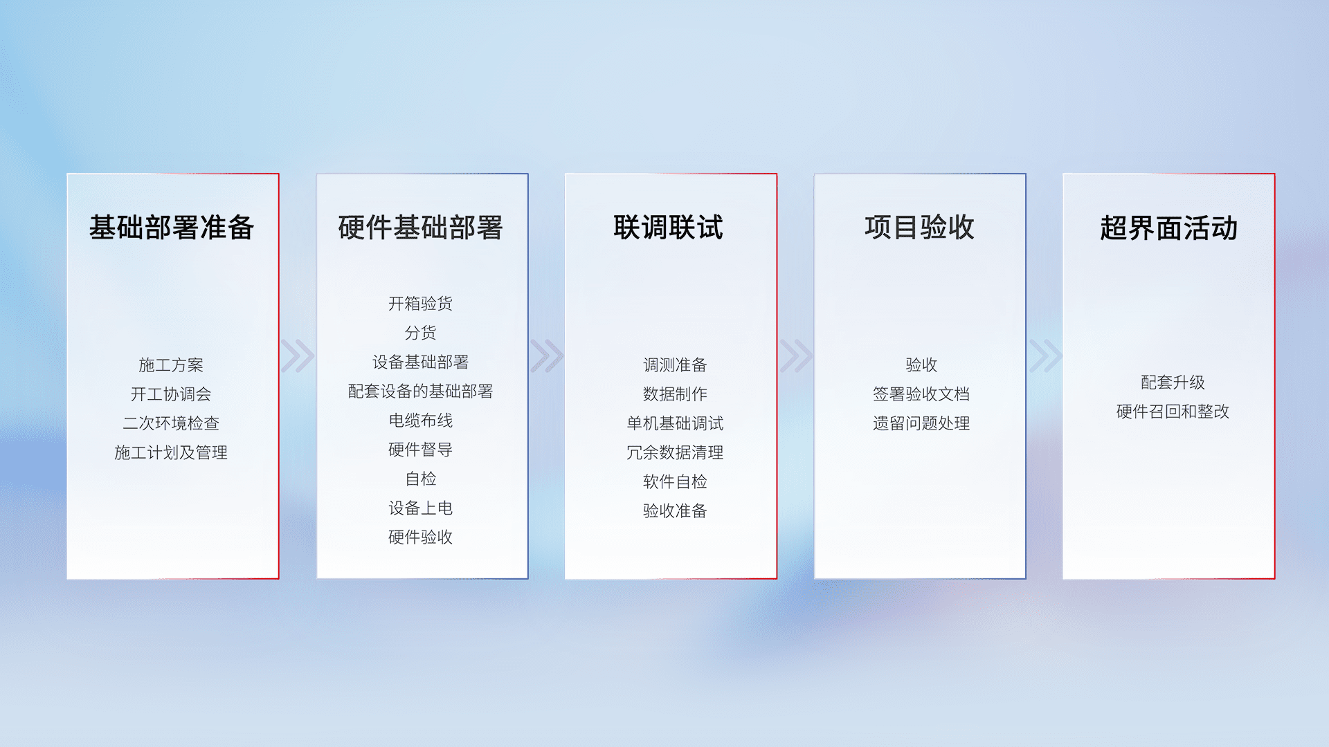 从基础部署准备、、硬件基础部署、、、、联调联试、、项目验收、、、、越界面活动的全过程可追溯,,,保证施工质量和进度。。。。