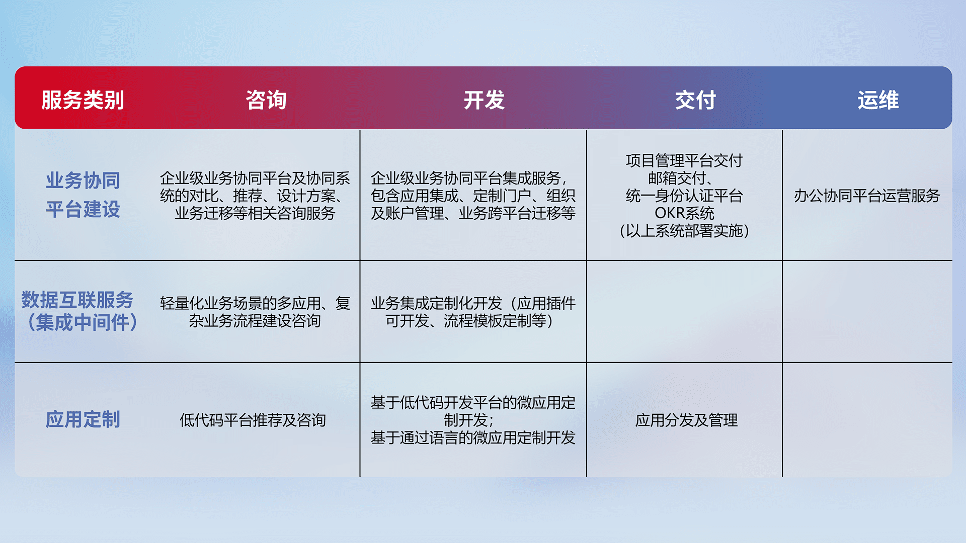 针对钉钉、、企微、、IDaas等平台级产品提供产品的规划、、方案、、、交付、、、、定制化开发等服务,,,,实现如统一协同办公、、、智能客户服务、、混合会议管理、、、、智能数据查询、、等业务场景,,实现数字化转型。。